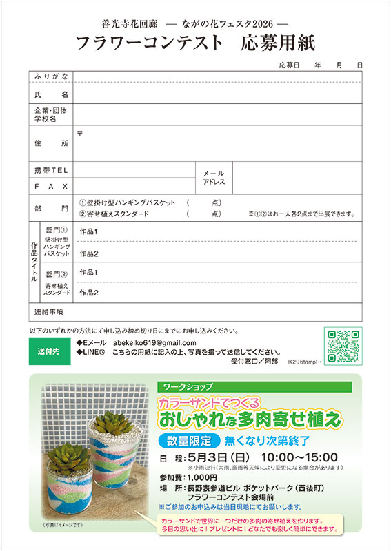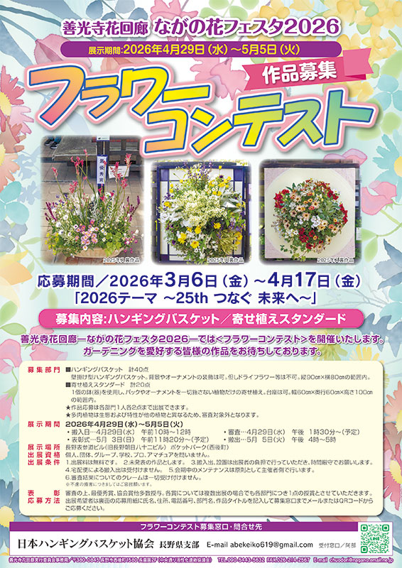 ガーデニング愛好家に人気の、ハンギングバスケット、寄せ植え(スタンダード)のコンテストです。 <主催>日本ハンギングバスケット協会長野県支部 <搬入日>4月29日(水)10:00〜 <表彰式>5月3日(日)11:20〜