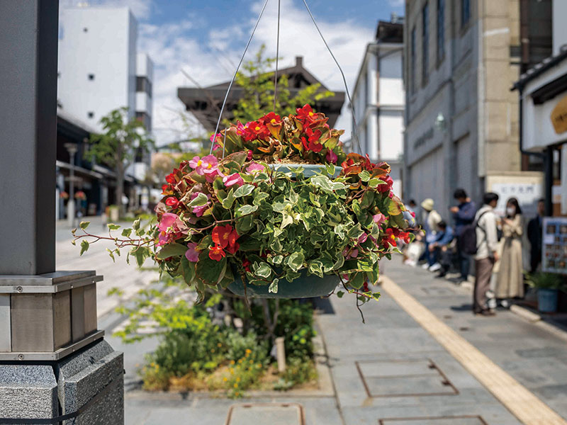 おもてなしの心を込めて、商店街がハンギングバスケットなどでまちを彩ります。