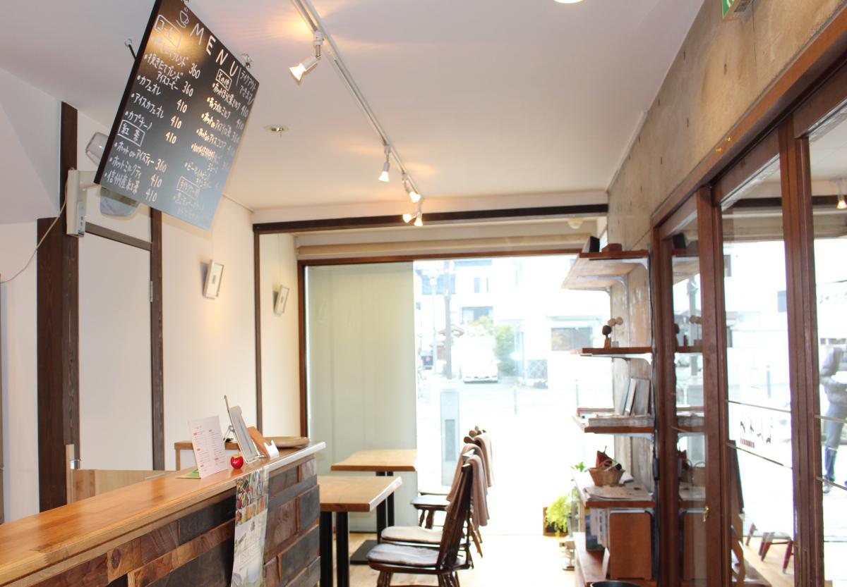 木の温もりが心地よい空間。 テーブル席には1枚板を、カウンターの壁には古い蔵の柱をアレンジして使っています。 棚には信州ゆかりの書籍を多く配置。お茶を飲みながらゆっくりとご覧いただけます。 スタッフは地元のフリーライター。まちの情報に詳しいので、オススメの観光情報など、お気軽にお尋ねください。